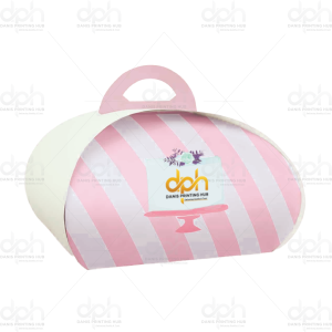 A stylish square cake box with a white base and a light pink lid, adorned with an orange and yellow cupcake graphic. Ideal for packaging bakery delights.