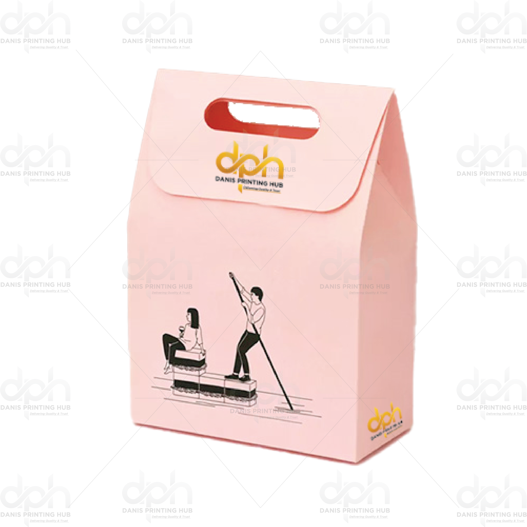 A charming pink pouch bag with a handle cut-out, adorned with a traditional manual printing press illustration.